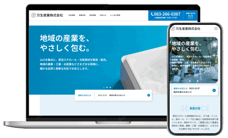 ビジネスアシストで戦略に基づいたコンセプト立て、ディレクション、デザイン、撮影、コーディング、SEO対策までトータルでWEBサイト制作を行った、万生産業株式会社様サイトを2025年9月30日に公開しました。
